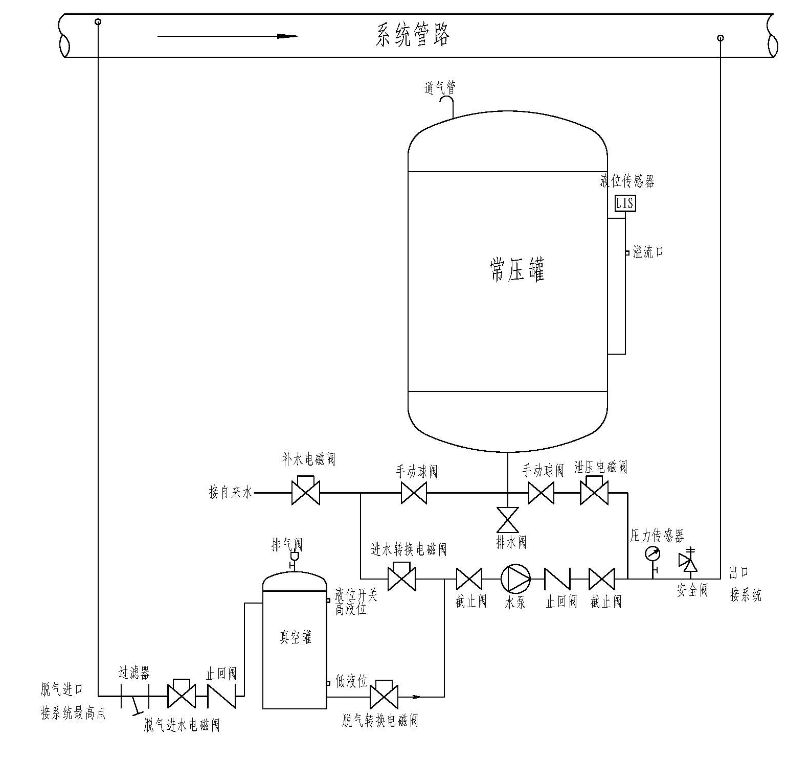 1)進水階段:系統中(zhōng)的液體(tǐ)進入脫氣罐,液體(tǐ)中(zhōng)含有(yǒu)的所有(yǒu)氣體(tǐ)都會被釋出,并通過脫氣罐頂部的自動放氣閥與系統分(fēn)離。